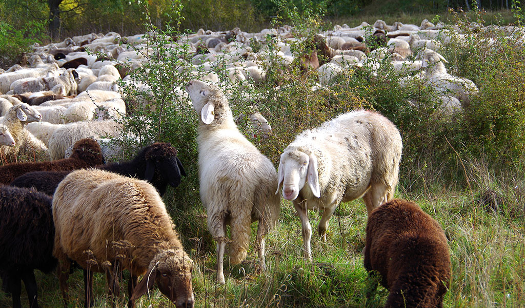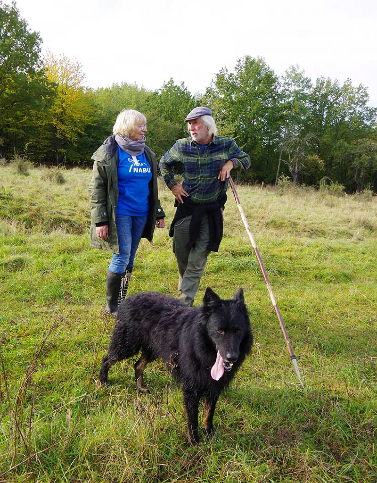 An einem Dienstagmorgen 9.30 Uhr im Oktober im Naturschutzgebiet „Am Rümpfwald“: Das Gras ist nass vom lange ersehnten Regen der vergangenen Tage, die Sonne lacht, den Himmel trübt keine Wolke – und die Schafe blöken. Etwa 1.000 von ihnen werden von Sepp Schwaiger und seinem Hütehund Leo über die Wiesen getrieben. Die Aufgabe der Schafe ist, die Verbuschung des Offenlandes zu verhindern, indem sie sich über die geschützte Fläche knabbern und fressen. Als tierische Weidehelfer leisten sie dabei einen wichtigen Beitrag, das Gebiet als Offenland zu erhalten. Gräser, Beeren, Äpfel, Gras, Eicheln, kleine Büsche: Der Speiseplan ist abwechslungsreich. Der Schäfer trifft sich mit Salome Winkler vom NABU Erzgebirgsvorland, dessen Unterpächter er ist und mit dem er gemeinsam das Wohl des Naturschutzgebiets im Auge behält. Regelmäßig kommt die Geschäftsführerin des NABU-Regionalverbands hier vorbei, um den aktuellen Stand auf dem Areal zu begutachten.
